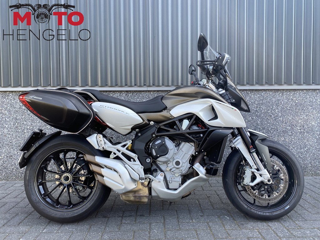 MV Agusta Stradale 800 met tweedelige kofferset. Origineel MV Agusta kofferset, standaard voorzien van quickshifter. Prachtige machine met Super Motard uiterlijk en lage kilometerstand. Onderhoud gehad en voorzien van nieuwe ketting en tandwielen. Vorige eigenaar is een vriend van Moto Hengelo en is nauwkeurig met onderhoud. Voorlopig rijden, rijden, rijden!