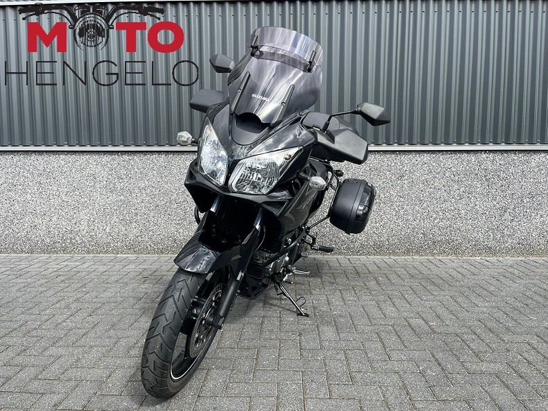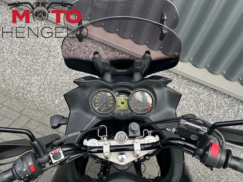 Nette V-Strom 650 met 3 delige kofferset, valbeugels, handkappen, navigatie voorbereidt, USB aansluiting op het stuur, handvatverwarming, smoked screen met flipup en witte knipperlichtglaasjes. Nette tourmachine!