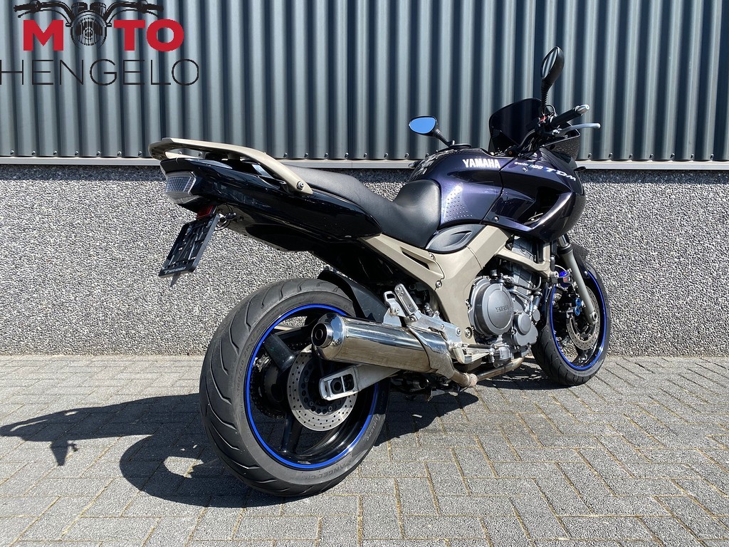 Nette TDM900 met valbescherming, kleine knippers, korte kentekenplaathouder, handvatverwarming, tankring voor tanktas en een donkere ruit.